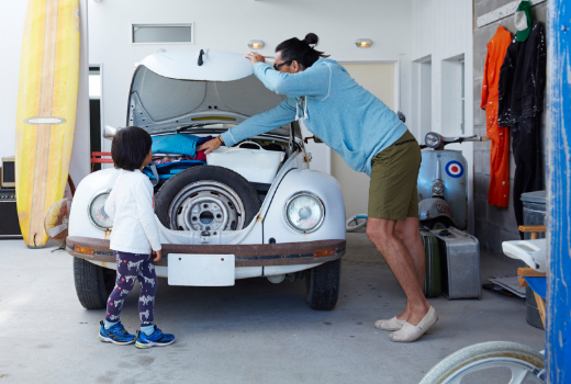 ガレージの中に椅子やテーブルを置けば、愛車のメンテナンスやカスタマイズができ、さらには大好きな愛車を眺めながらくつろいだり、音楽を聴いたりと自分だけの書斎が完成!